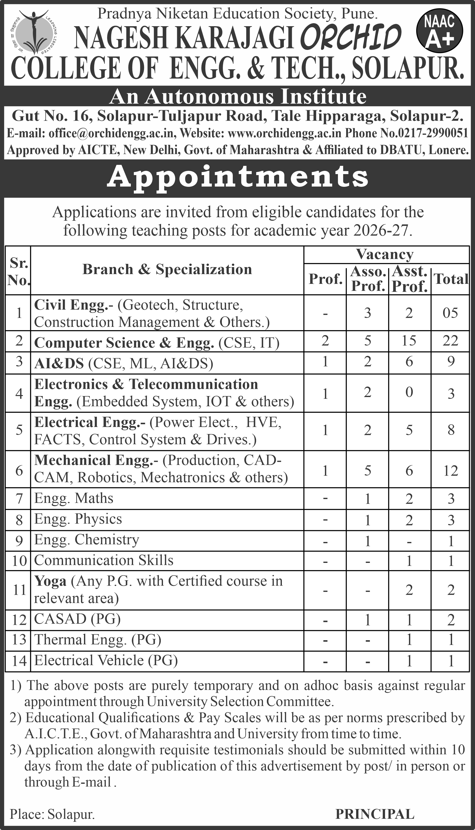 N. K. Orchid College Of Engineering & Technology (NKOCET), located in Solapur, is an autonomous college managed by the Pradnya Niketan Education Society (PNES) of Pune. Established in the academic year 2008-09, NKOCET has been dedicated to providing high-quality technological education. The college is approved by the All India Council for Technical Education (AICTE), New Delhi, and is recognized by the Government of Maharashtra. NKOCET has also been accredited with an NAAC A+ grade, reflecting its commitment to academic excellence and quality education.
